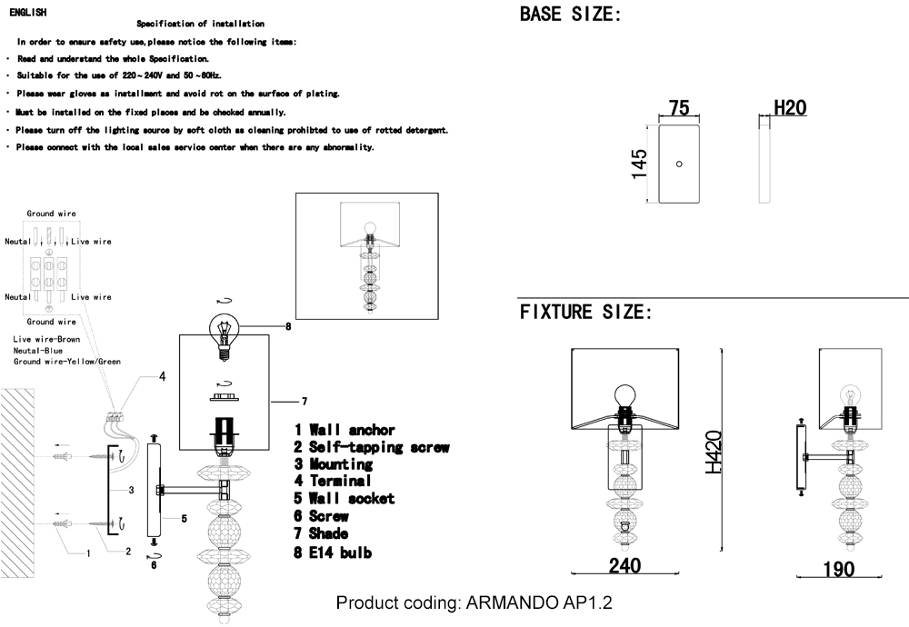 | Размер светильника от стены (мм) | 190 |