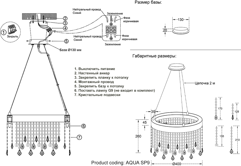 | Дополнительные параметры | Серия светильников Aqua - это воплощение элегантности и изысканности в дизайне освещения. Каждый светильник этой серии создан с учетом того, чтобы напоминать капли воды, которые ласкают поверхность озера или тихо падают с листьев деревьев. Особенностью светильников Aqua являются их декоративные элементы, выполненные из хрусталя. Этот благородный материал придает светильникам особый шарм и изысканность. Благодаря использованию хрусталя, свет внутри светильников играет на его поверхности, создавая прекрасную игру света и тени. |