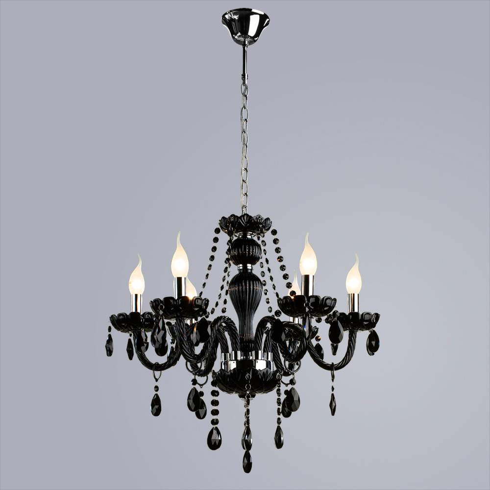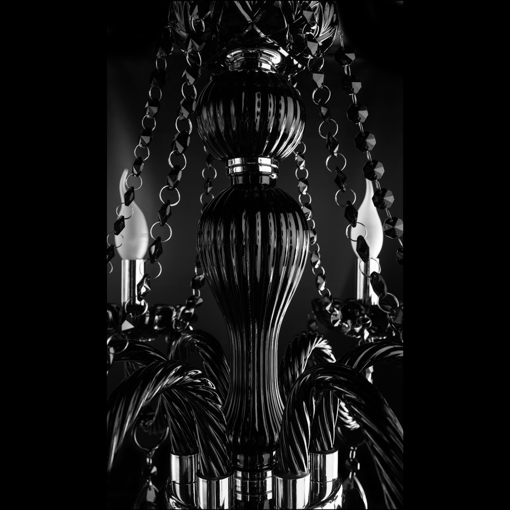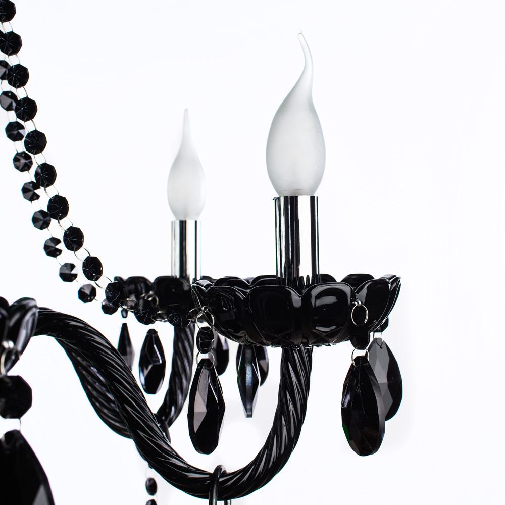 Основной акцент композиции модели направлен на оформление стеклянной арматуры. Каждый канделябр выполнен в виде черной резной цветочной чаши, украшенной гранеными удлиненными подвесками. Черный цвет обрамления люстры из Италии подчеркивает яркость стилизованных под свечи ламп.
